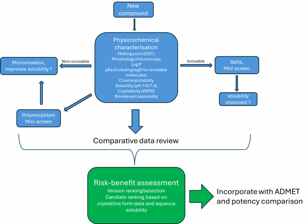 While ADME, potency and safety are the core drivers for effective lead optimisation and candidate selection, their impact upon the physicochemical properties that manifest as solid form behaviour (and performance) also requires inclusion as part of the overall risk-benefit assessment.